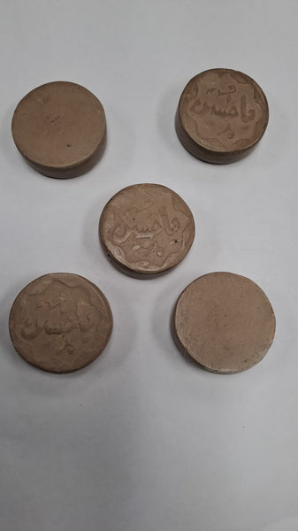 Turbah which is prayer clay tablets used in prostration during salat prayer by Shia Muslims. Made of the soil of Karbala. The use of a turbah is recommended in the Twelver Shia school of Islam, a unique practice of the sect, and many Hadiths mention the benefits of prostration (Sajda) upon soil or an alternative natural material. The most favored soil is that of Karbala, the site of the martyrdom of Husayn ibn Ali; however, soil from anywhere may be used. In the absence of soil, plants or items made from plants may be substituted. This provision has been extended to include the use of paper. According to Abu Sa`id al-Khudri: “I saw Allah’s Apostle prostrating in mud and water and saw the marl of mud on his forehead.” Though Muhammad prayed on the ground, the hadith Sahih al-Bukhari states that “Allah’s Apostle used to pray on Turbah.”